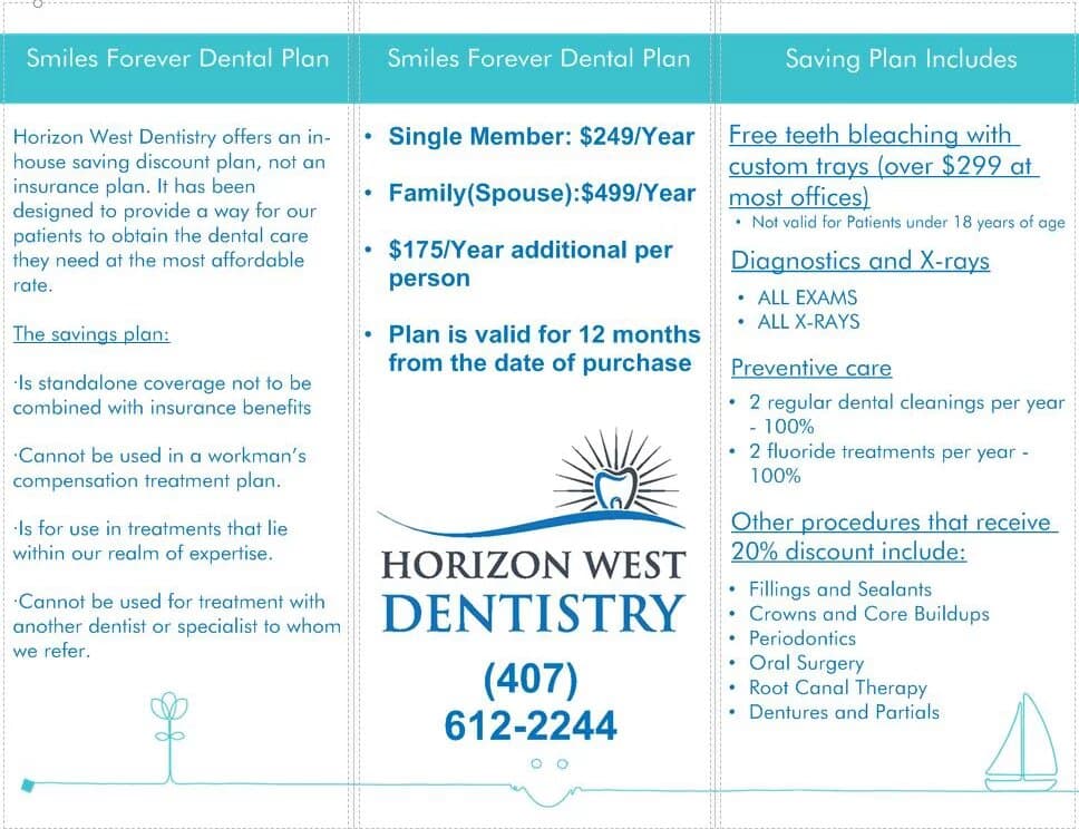 At Horizon West Dentistry, we believe in providing the highest quality dentistry at a reasonable price. As part of our commitment to making comprehensive dentistry affordable for our patients, we are pleased to offer our In-House SMILES FOREVER DENTAL PLAN.